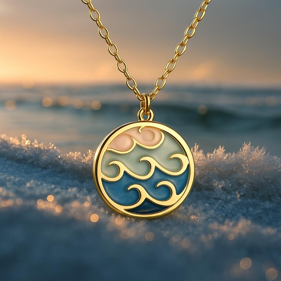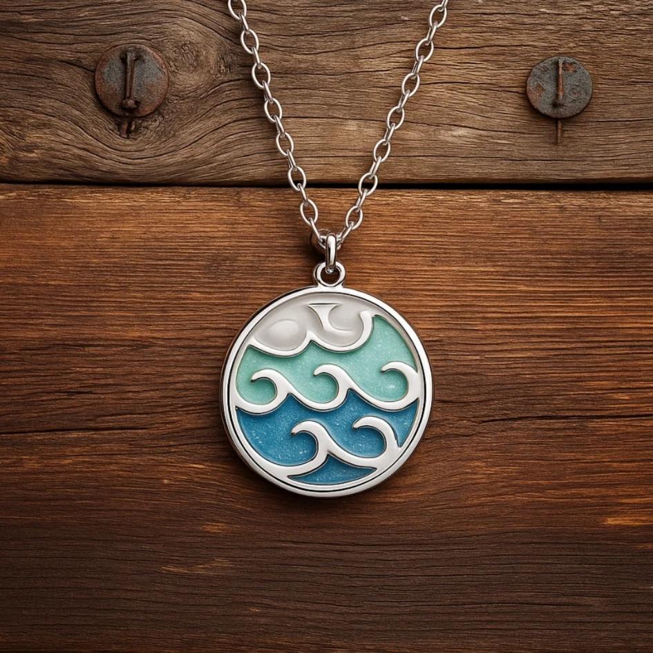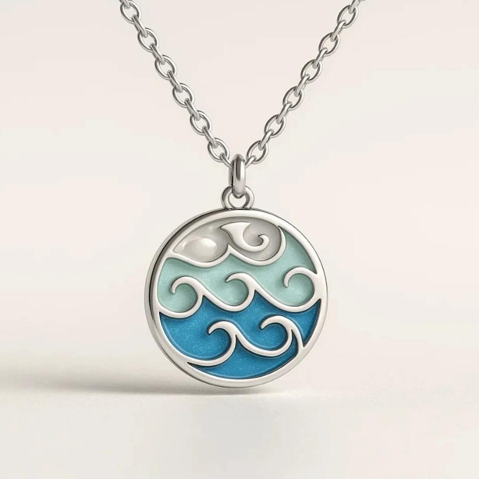 Un pendente che racchiude l’essenza delle onde, con linee fluide che si rincorrono come il ritmo del mare. Le sfumature blu e argento si fondono in un disegno armonioso, evocando quiete, profondità e libertà. Un gioiello che racconta la connessione con l’oceano e la sua bellezza senza tempo.