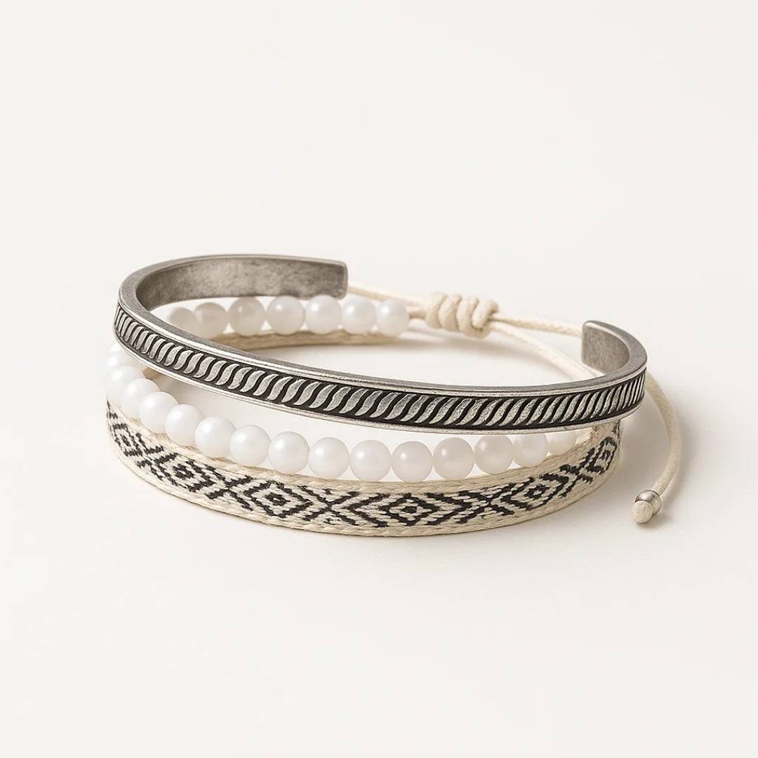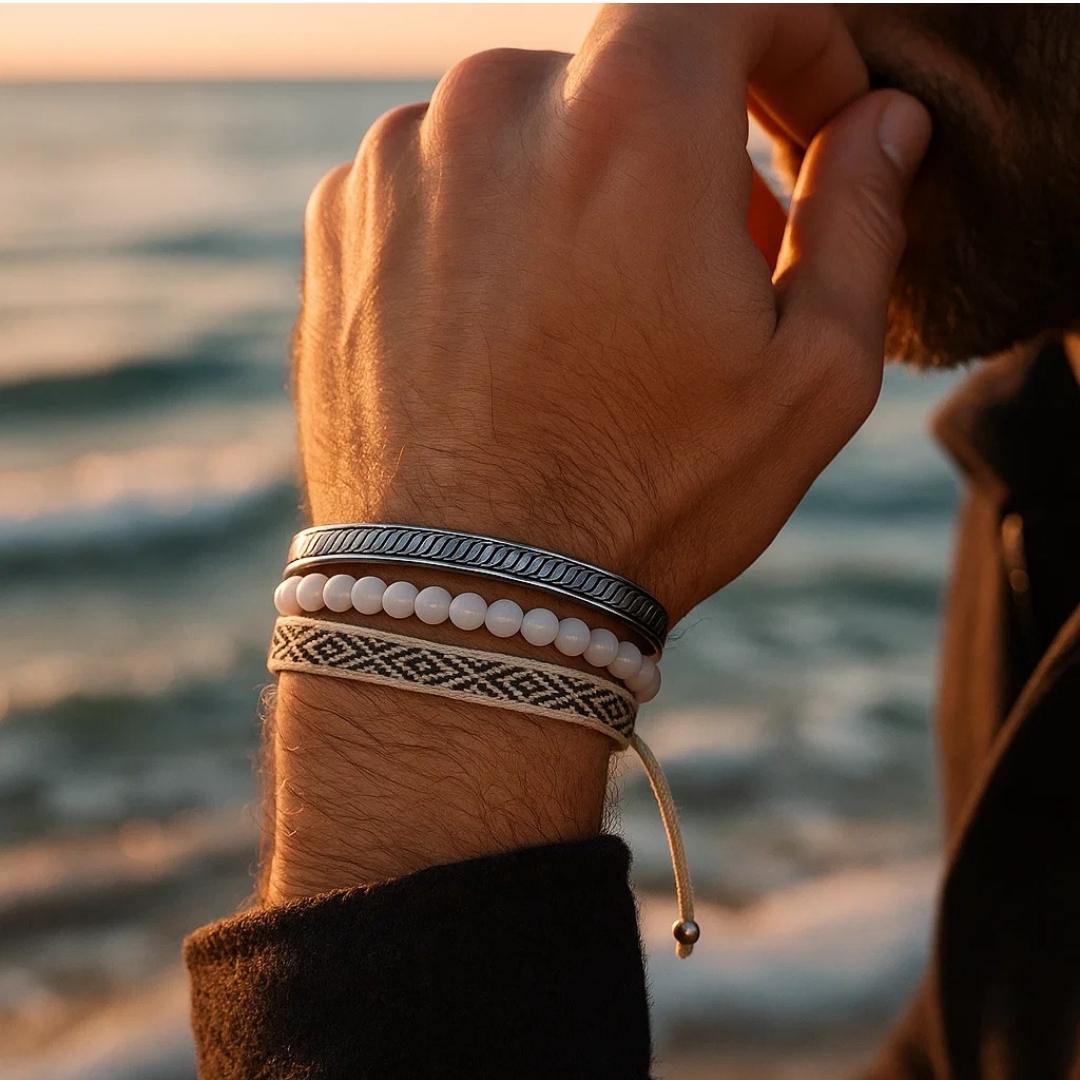 Tre linee, un solo carattere: acciaio inciso, corda tessuta e perle latteo-opache creano un mix boho pulito, maschile e rilassato. Un bracciale che porta il respiro del mare dโinverno in chiave neutraโdiscreto con t-shirt, deciso con maglia e denim.