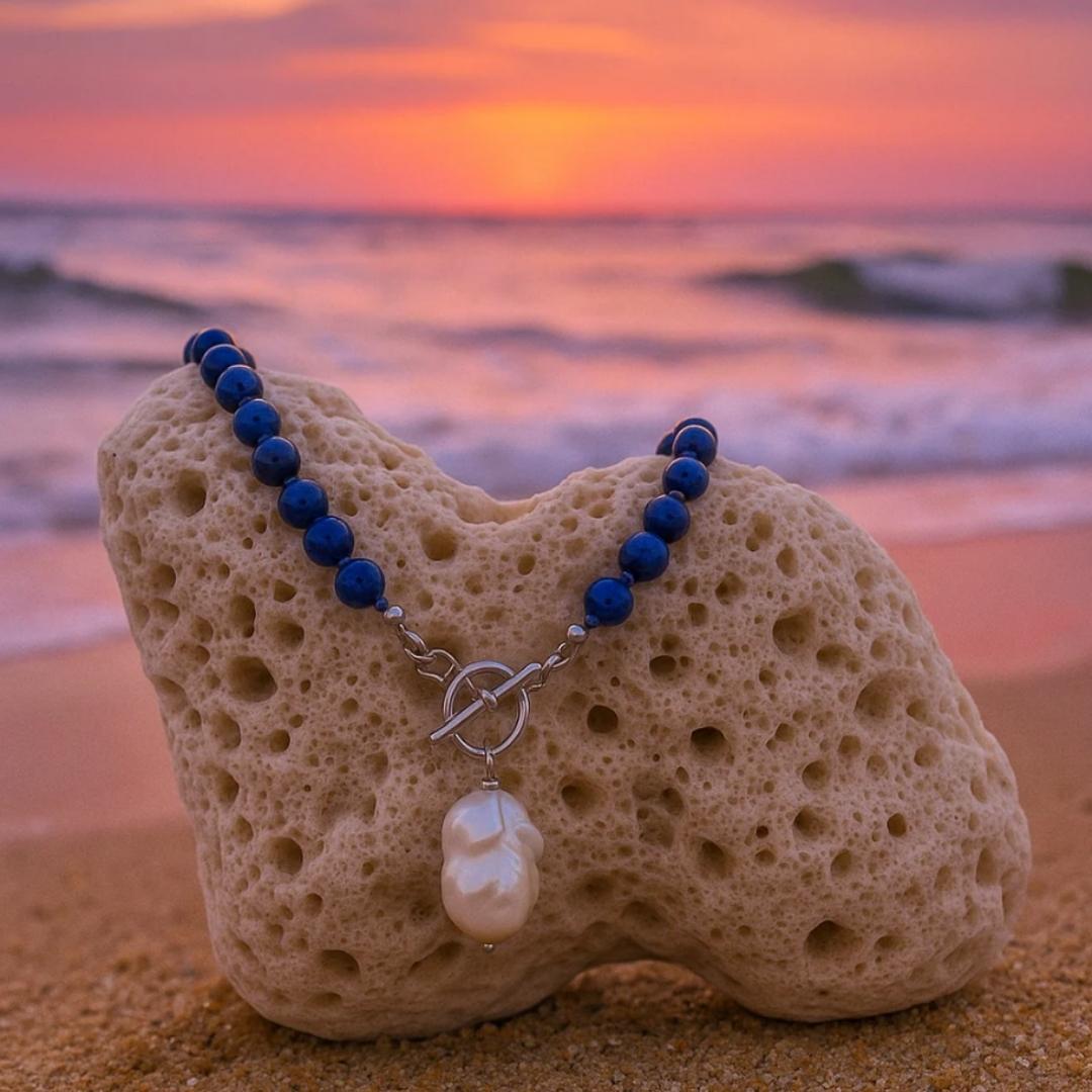 La collana Amara unisce l’intensità delle perline di pietra blu, profonde come l’oceano, alla luminosità di una perla da laboratorio che richiama la delicatezza della schiuma marina. Un gioiello che cattura l’essenza dei contrasti marini: forza e dolcezza, profondità e luce..
