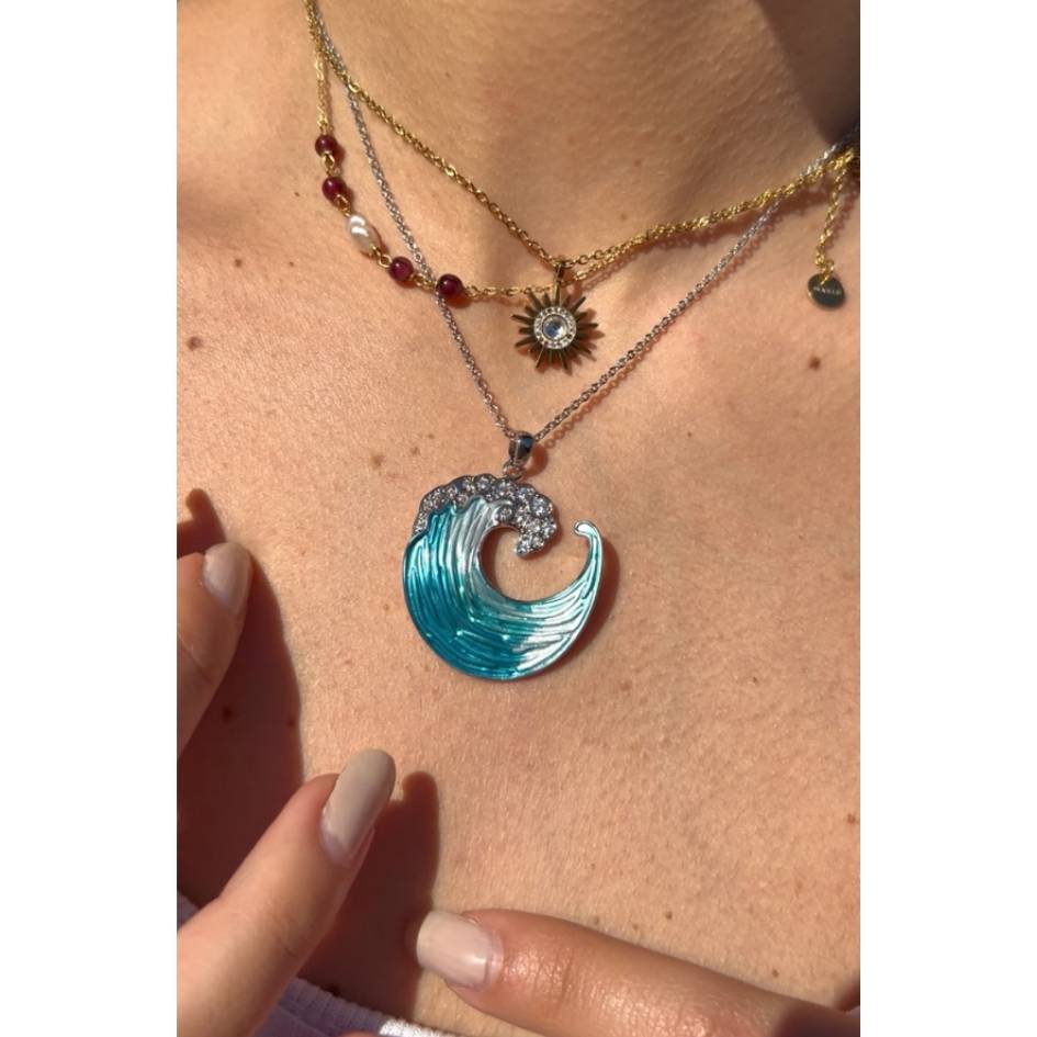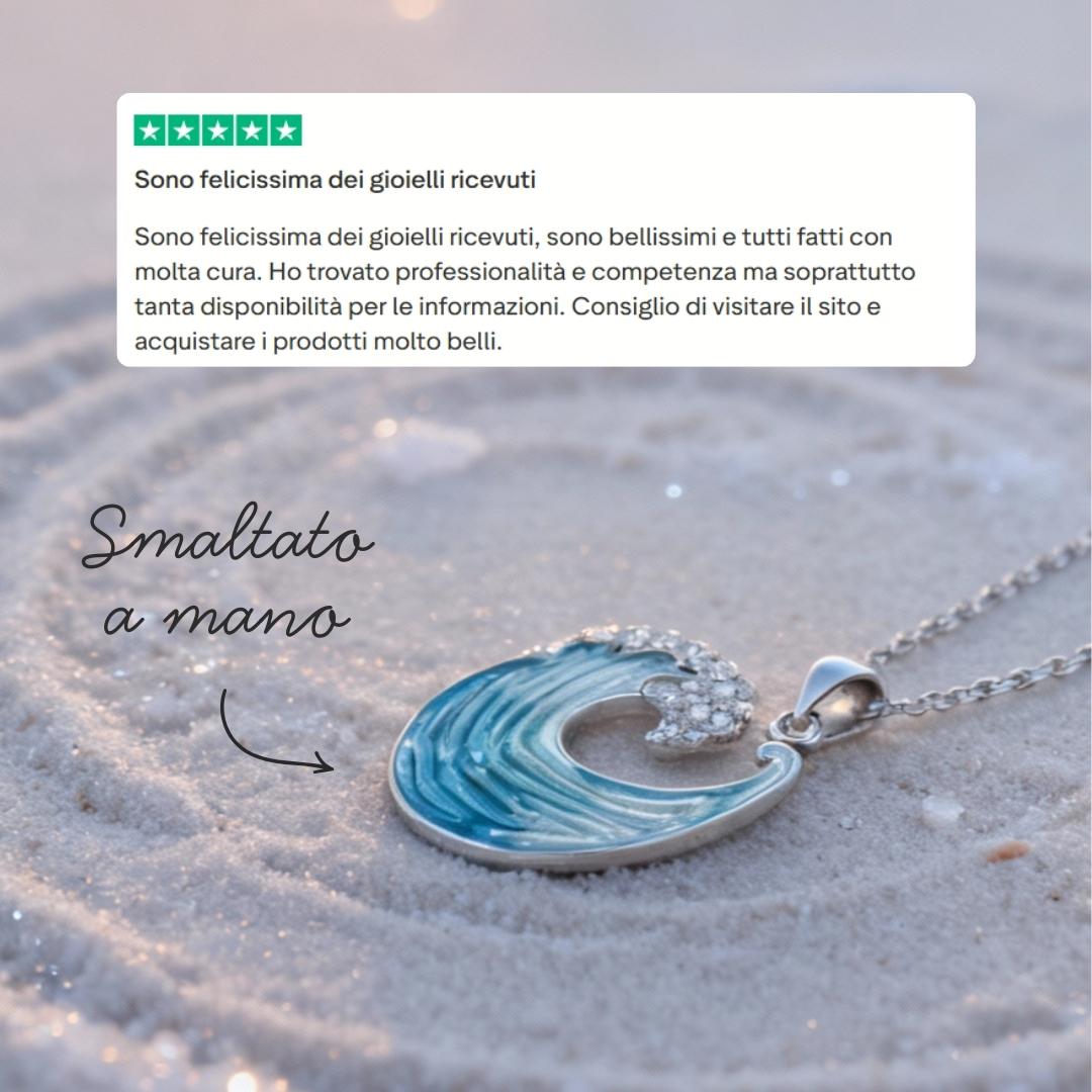 Il ciondolo, smaltato a mano nelle tonalità del turchese e dell’acquamarina, è rifinito con zirconi bianchi disposti come creste di schiuma: ogni pietra è incastonata con cura artigianale.