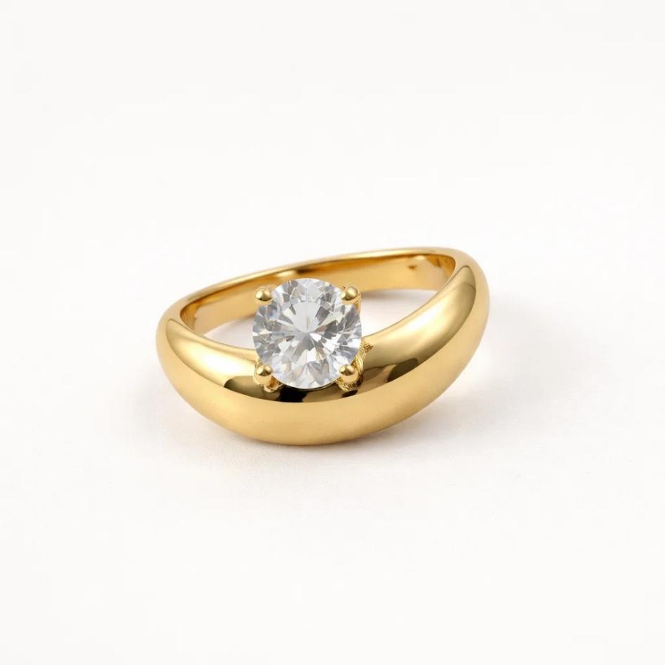 Aurena è un anello dal profilo pieno e morbido, come un’onda che abbraccia la riva, sormontata da un grande zircone chiaro che brilla come una luna piena sul mare calmo. Un gioiello essenziale ma scenografico, pensato per catturare la luce e lo sguardo a ogni gesto.