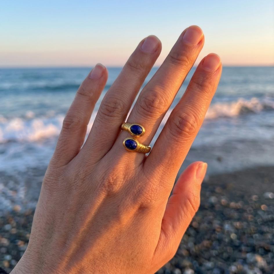Azuryon avvolge il dito come un’onda dorata che termina in due pietre di lapislazzuli, profonde e puntinate d’oro come un cielo notturno. Un design aperto e avvolgente, perfetto per chi ama i dettagli decisi ma eleganti.