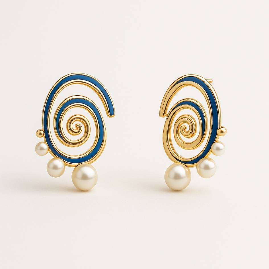 Gli orecchini Delyra catturano il movimento eterno del mare: spirali dorate che ricordano la danza delle correnti, illuminate da smalti blu intensi e impreziosite da perle da laboratorio, come gocce di schiuma adagiate sulla riva.