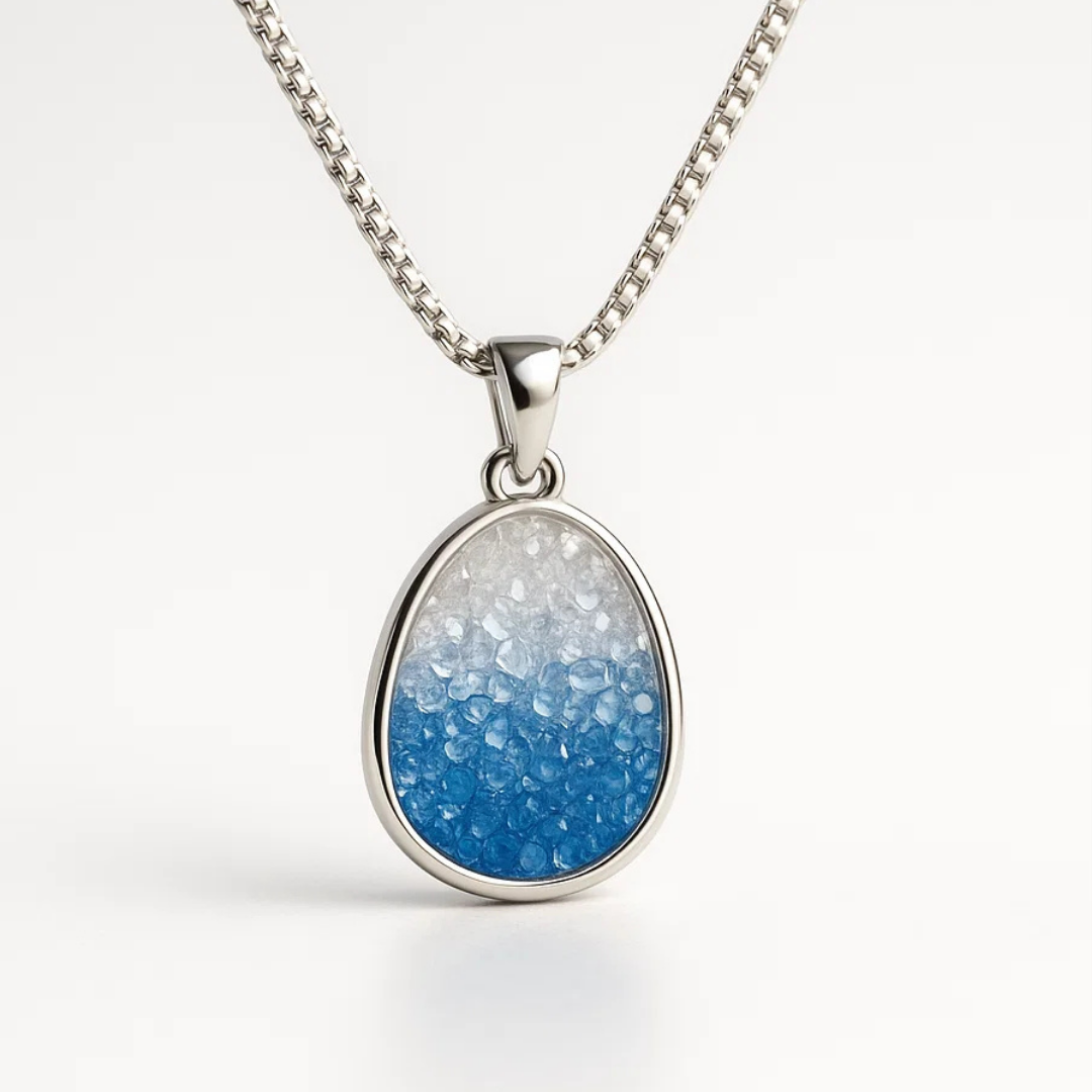 Un pendente raffinato che unisce piccoli zirconi e resina, creando una sfumatura che ricorda i riflessi dell’acqua al tramonto, dal bianco della spuma fino al blu profondo delle onde.