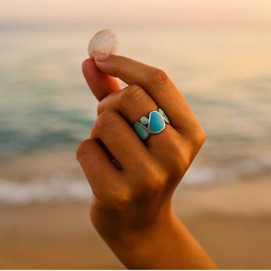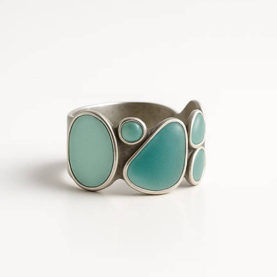 “Elenia” è un anello che sembra scolpito dalla brezza marina e dal silenzio delle onde al tramonto. Le sue forme morbide e organiche ricordano gocce d’acqua turchese e verde mare, adagiate su un profilo d’argento come conchiglie levigate dal tempo. 🌊