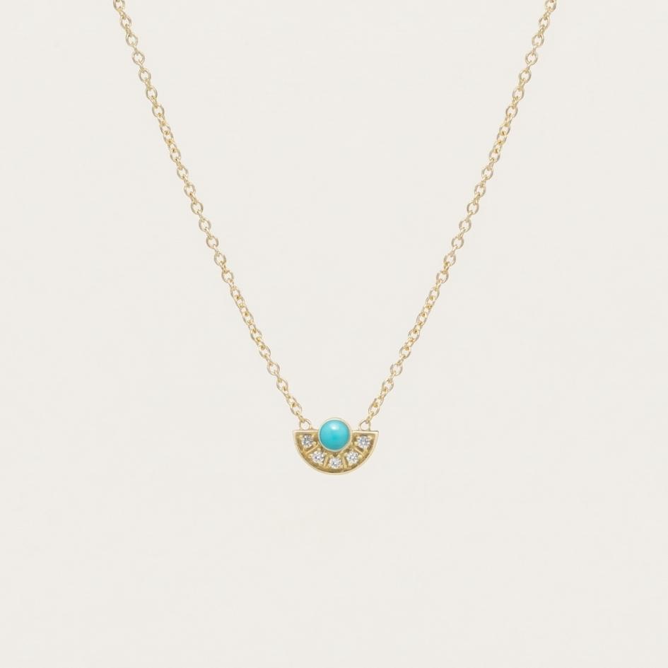 Ellisi è una collana discreta ma luminosa: un mezzocerchio di luce che abbraccia una sfera di turchese, come un piccolo sole che sorge dal mare. Perfetta tutti i giorni, aggiunge un tocco di azzurro elegante a maglioni, camicie e vestiti.