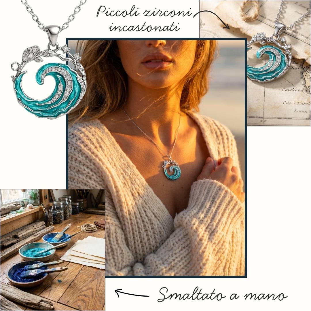 Mireya è un piccolo portale incantato che racchiude l’essenza più pura del mare in movimento. Il suo ciondolo–onda, lucido e ricco di dettagli, sembra aver catturato un istante di oceano per trasformarlo in un talismano eterno: una cresta luminosa che si avvolge su sé stessa, impreziosita da minuscoli zirconi brillanti che ricreano la magia della schiuma che danza sulla riva.