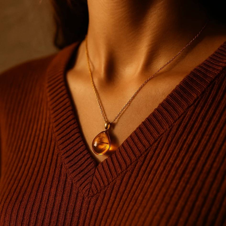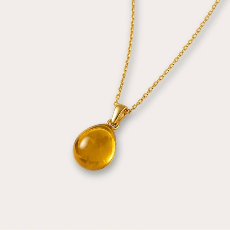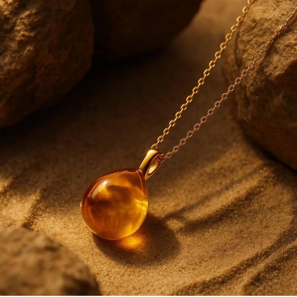 Un pendente che sembra custodire la luce del sole, con riflessi caldi e dorati che evocano il mare al tramonto.