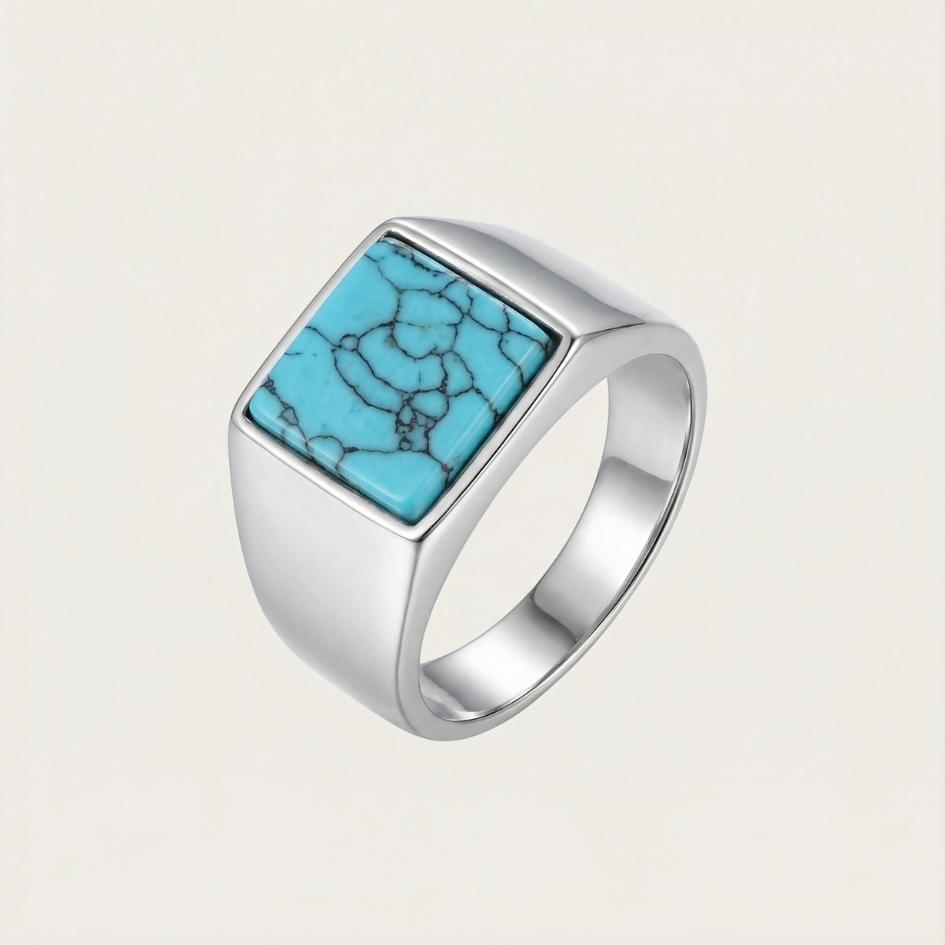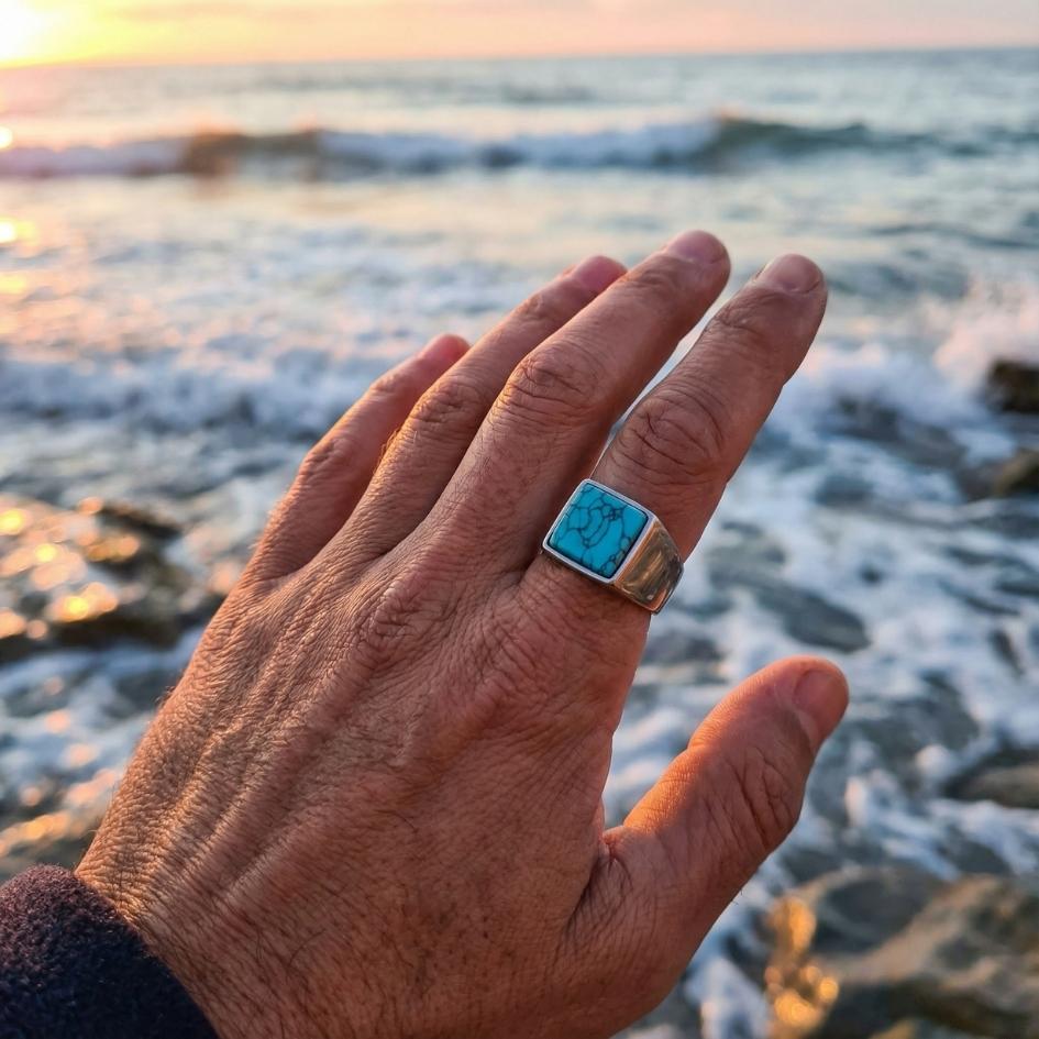 Kaelan è un anello maschile dal carattere forte: la pietra turchese, con le sue venature scure, ricorda la superficie del mare che si infrange contro gli scogli. Linee pulite, forma importante, per chi vuole un dettaglio semplice ma impossibile da ignorare.