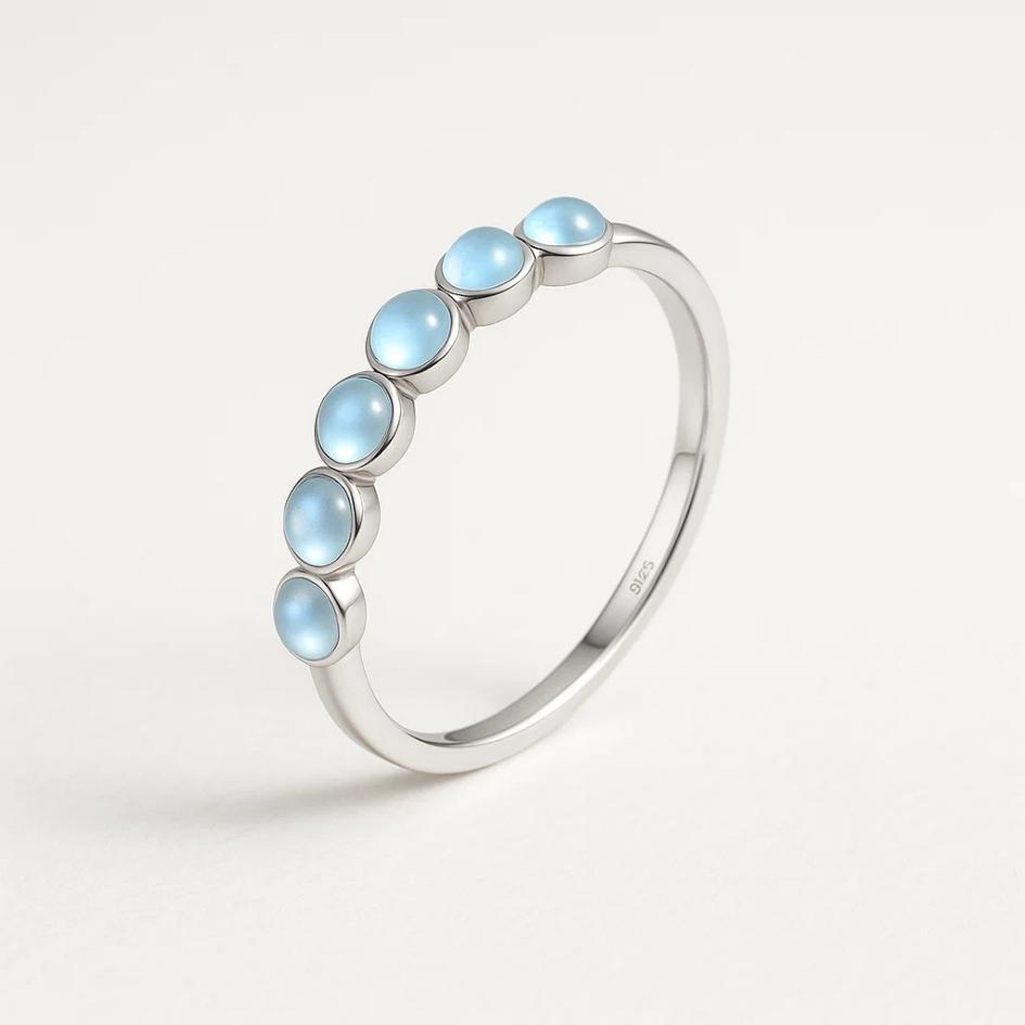 Fascia in metallo argentata, impreziosita da cinque pietre da laboratorio color azzurro ghiaccio a cabochon. Disponibile in diverse taglie, è perfetto sia da solo sia abbinato ad altri anelli per un effetto stacking.