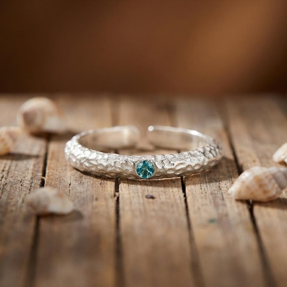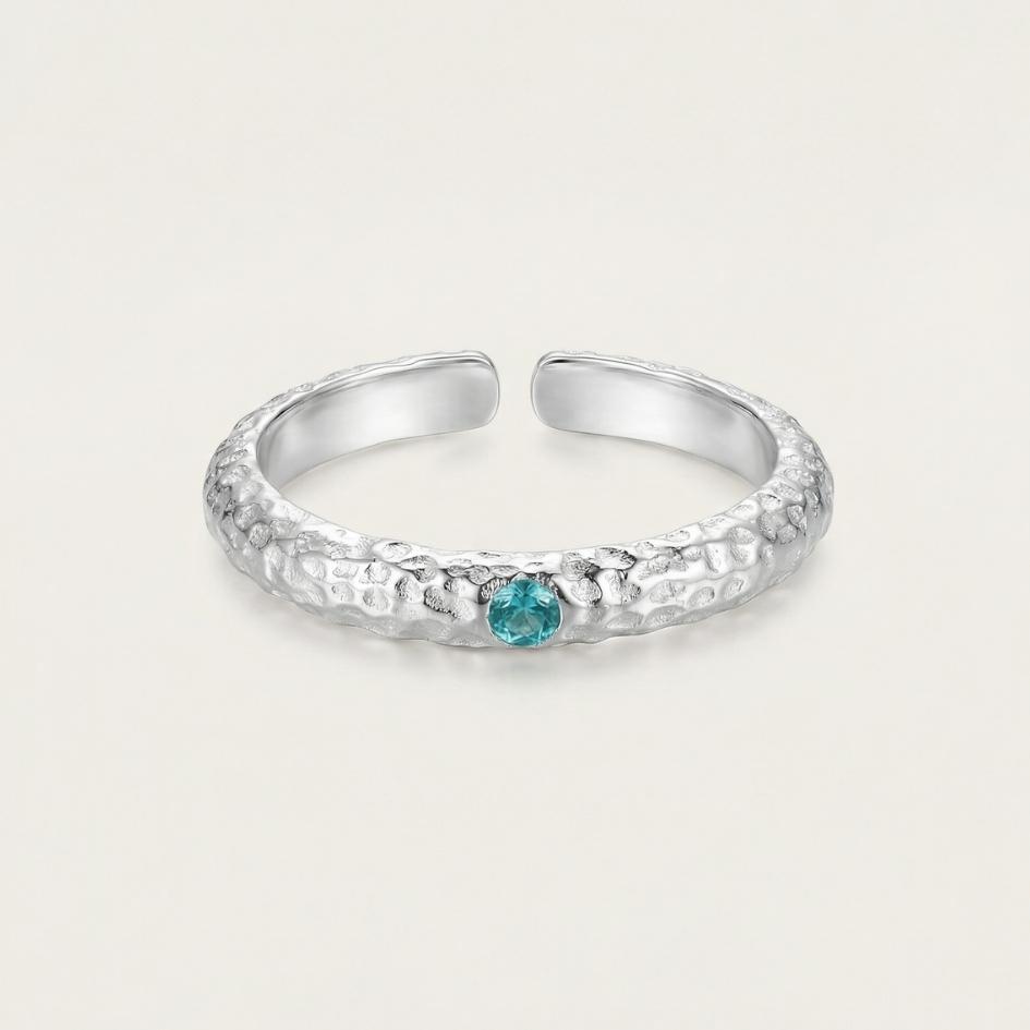 Lirian è un anello essenziale ma pieno di carattere: la superficie martellata ricorda la sabbia modellata dalle onde, mentre la piccola acquamarina al centro brilla come un riflesso d’acqua in una giornata limpida. Un dettaglio discreto, perfetto da indossare ogni giorno per portare con te un tocco di mare.