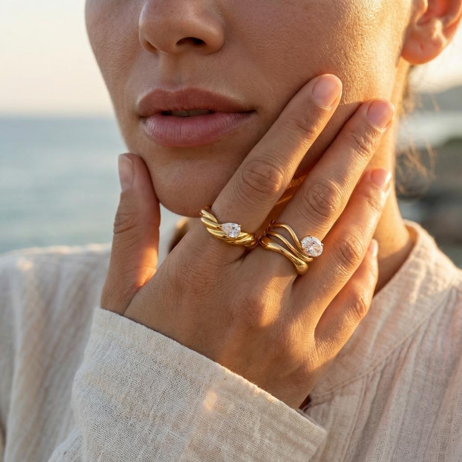 Realizzato in acciaio inossidabile con elegante placcatura dorata e zircone luminoso incastonato a goccia. Comodo e resistente, รจ perfetto da indossare ogni giorno o da abbinare ad altri anelli per creare il tuo personale gioco di onde brillanti.