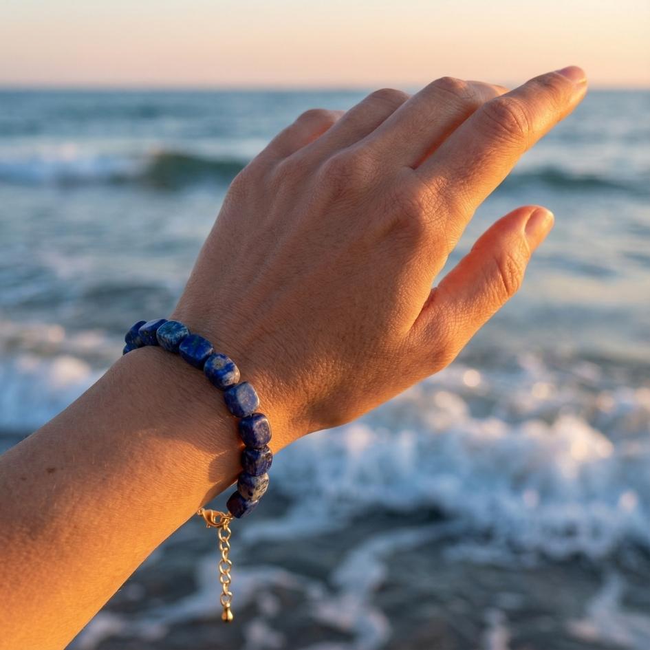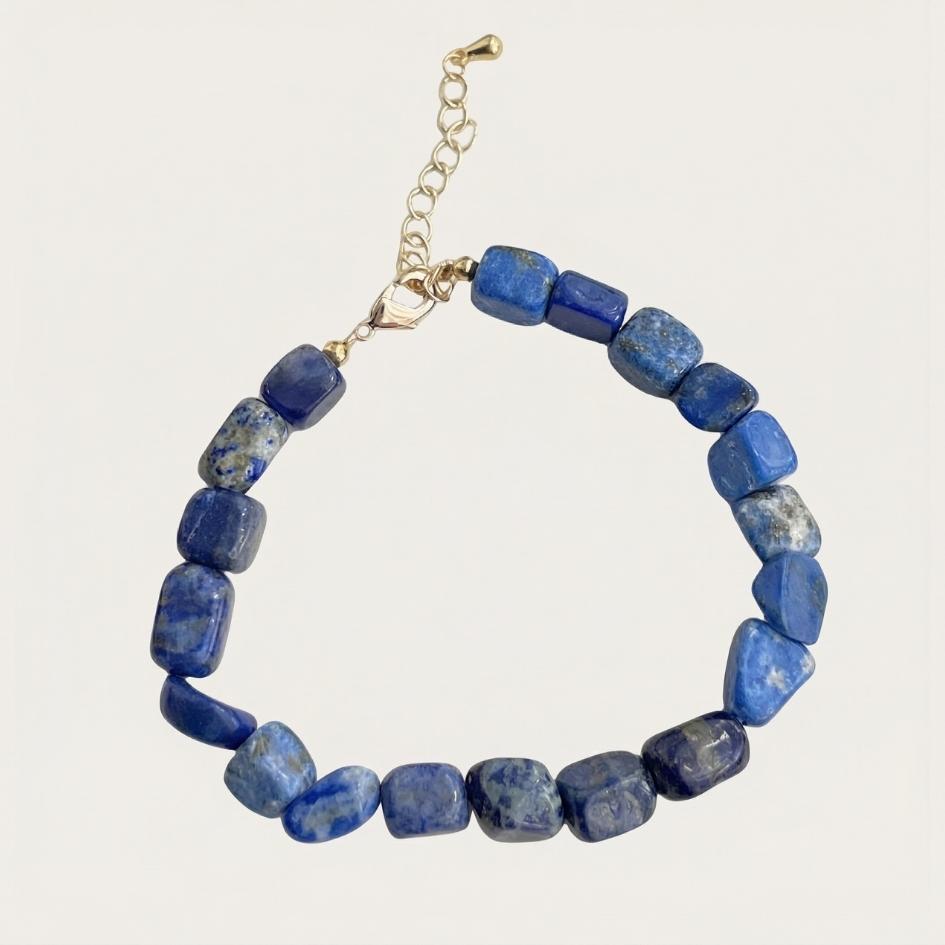 Composto da pietre naturali di lapislazzuli lavorate a cubetti irregolari, montate su elementi in ottone con chiusura e catenina regolabile. Pensato per il polso femminile, è perfetto da solo o abbinato ad altri bracciali marittimi.