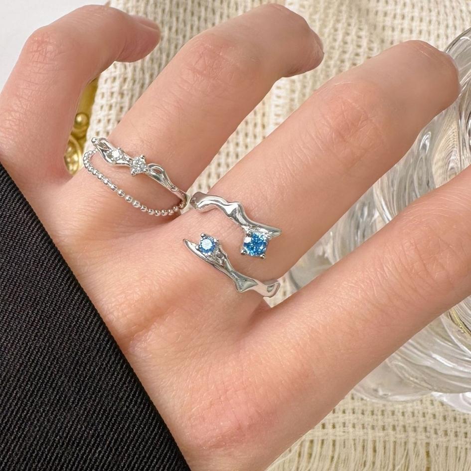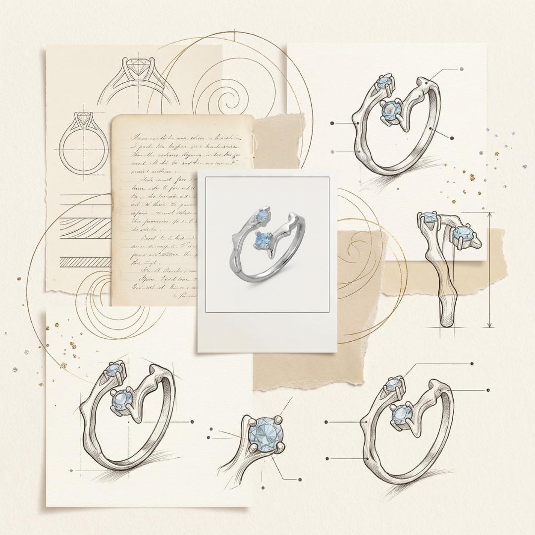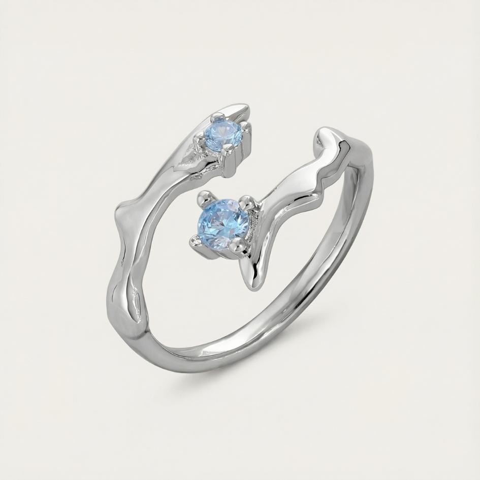 Lysea è un anello che sembra disegnato direttamente dalle onde: la fascia aperta avvolge il dito con due piccole creste lucenti che si inseguono, mentre le pietre azzurre brillano come gocce di mare al sole. Un dettaglio leggero, romantico, perfetto per chi ama i gioielli che raccontano una storia senza bisogno di troppe parole.