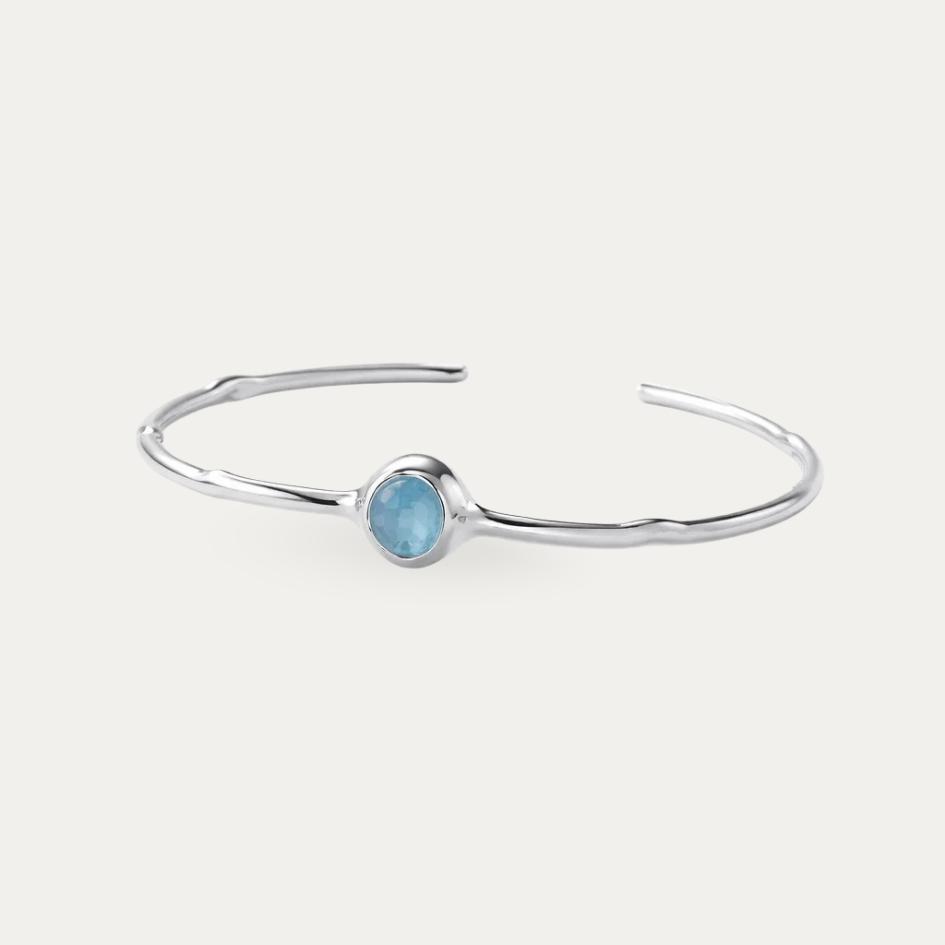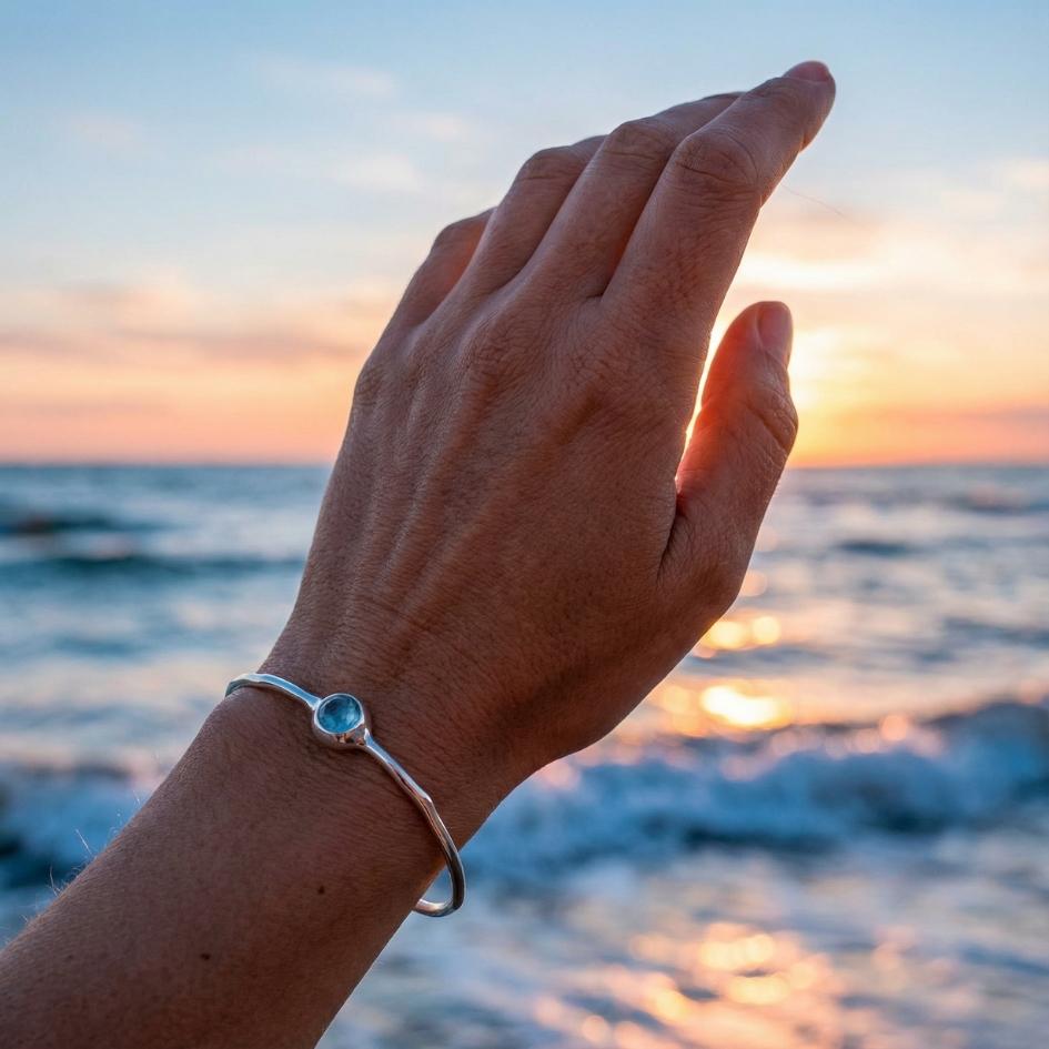 Melyra è un bracciale minimal che sembra disegnare un’onda leggera sulla pelle: una linea lucida che abbraccia il polso e al centro una pietra azzurra che ricorda il mare visto attraverso la luce del mattino. Discreto, elegante, perfetto da indossare ogni giorno.
