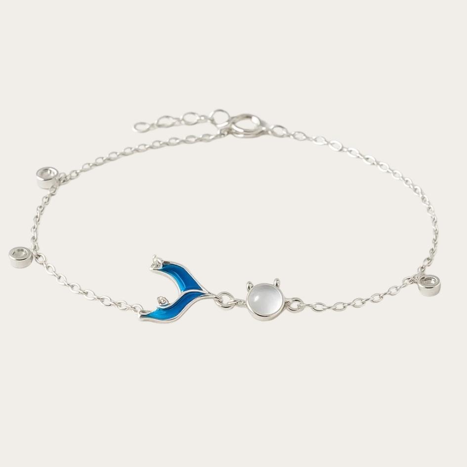 Naelya è un bracciale sottile che unisce una piccola coda di sirena blu alle morbide sfumature della pietra di luna. Leggero e discreto, aggiunge un accenno di mare ad ogni gesto, senza mai risultare eccessivo.