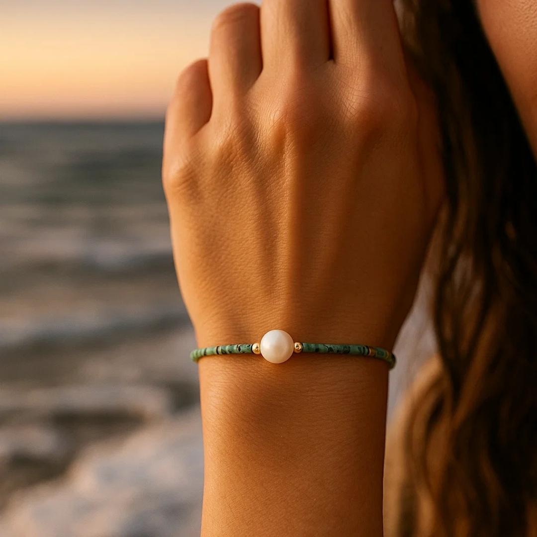 Sottile come un’onda gentile, questo bracciale elastico abbraccia il polso con micro tessere color acqua e una piccola perla al centro, luminosa come schiuma al mattino. Delicato, boho e femminile: un accento di mare da indossare ogni giorno, da solo o in stack per aggiungere una luce discreta.