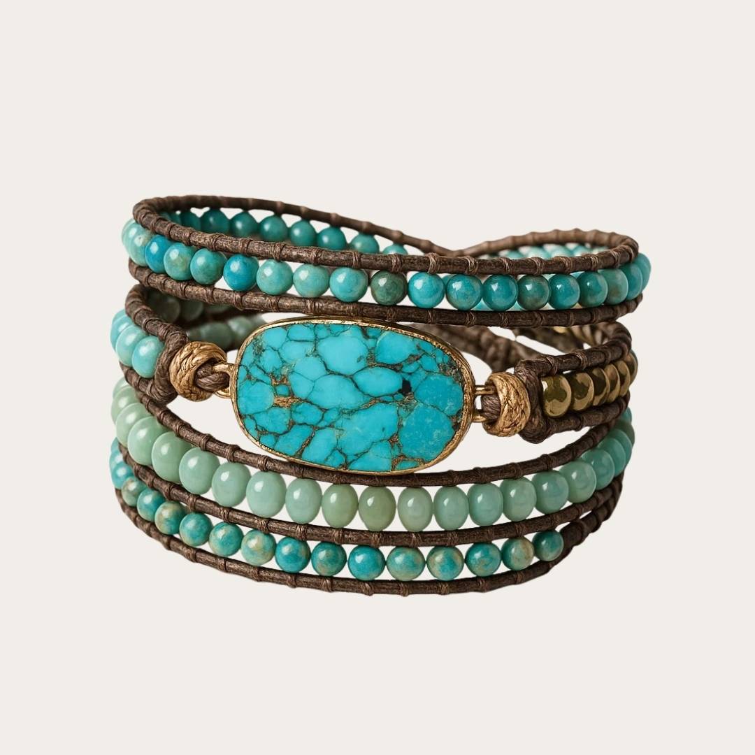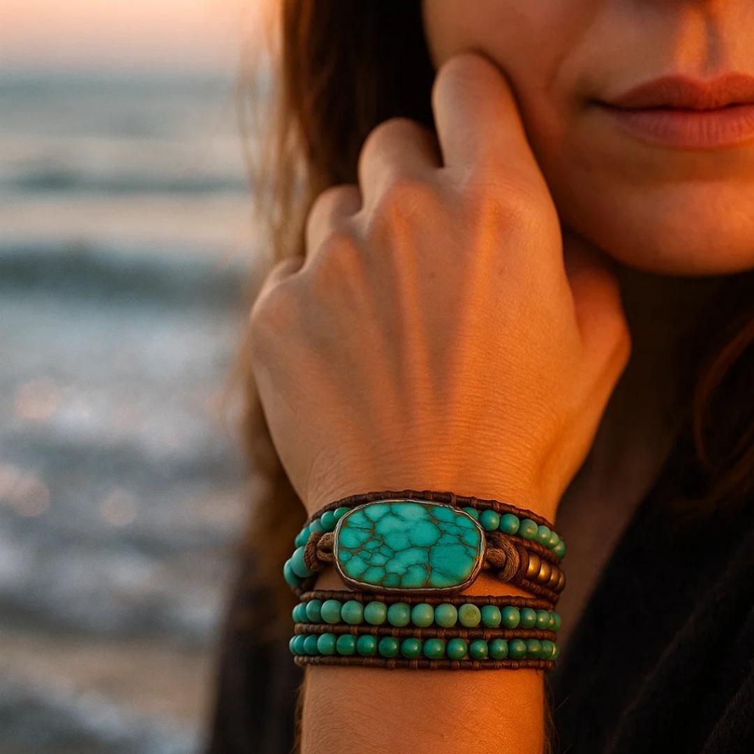 Un abbraccio di corda cerata che si avvolge al polso come una piccola marea, punteggiato da pietre vere in sfumature dโacqua e ottone caldo. La placca centrale, azzurra e screziata, cattura la luce con carattere boho marittimo: un bracciale che racconta il mare dโinverno con dolcezza e presenza.