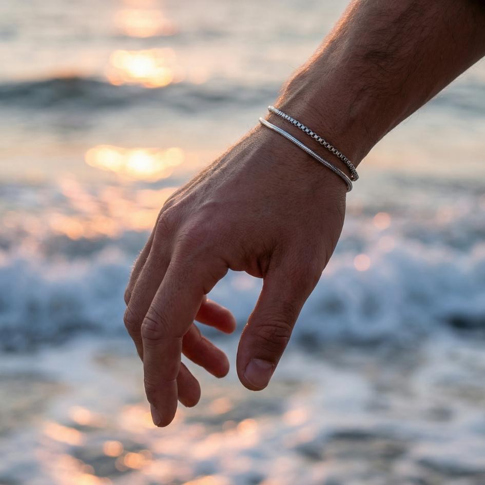 Immagina una passeggiata sul bagnasciuga in pieno inverno: il mare è freddo, il cielo si tinge d’oro e rosa, e ogni onda lascia una scia sottile sulla sabbia. Nerion nasce proprio da quell’istante. Le due linee di acciaio – una liscia e una a catena – seguono il profilo del polso come due piccole onde parallele, discrete ma impossibili da non notare. È il dettaglio perfetto per chi ama il mare e vuole indossarne la forza in modo minimal, elegante e senza eccessi.