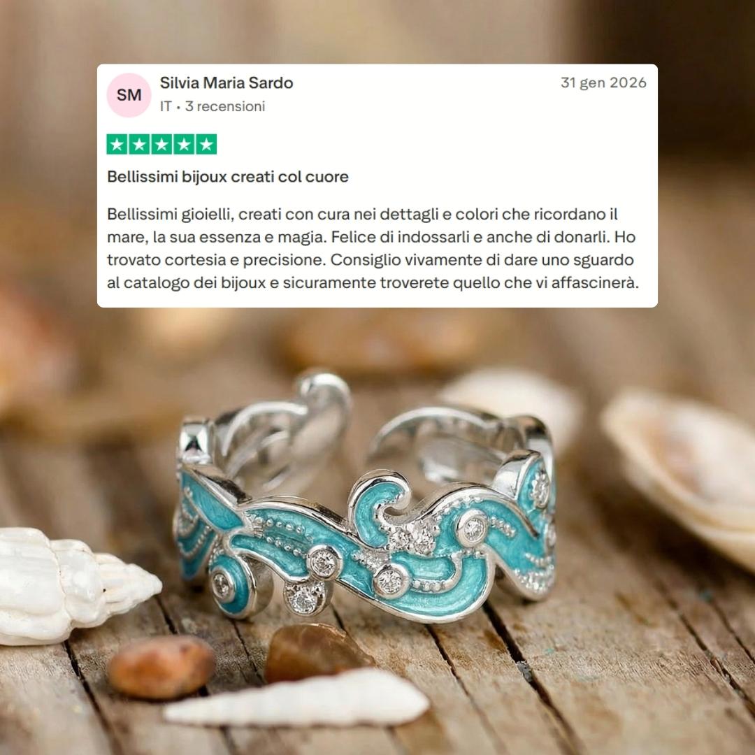 Neritha è un anello che cattura il movimento quieto del mare: linee fluide, smalto turchese e piccoli punti luce che brillano ad ogni gesto, come gocce d’acqua al sole. Un dettaglio pensato per chi vuole portare sempre con sé un frammento di oceano.