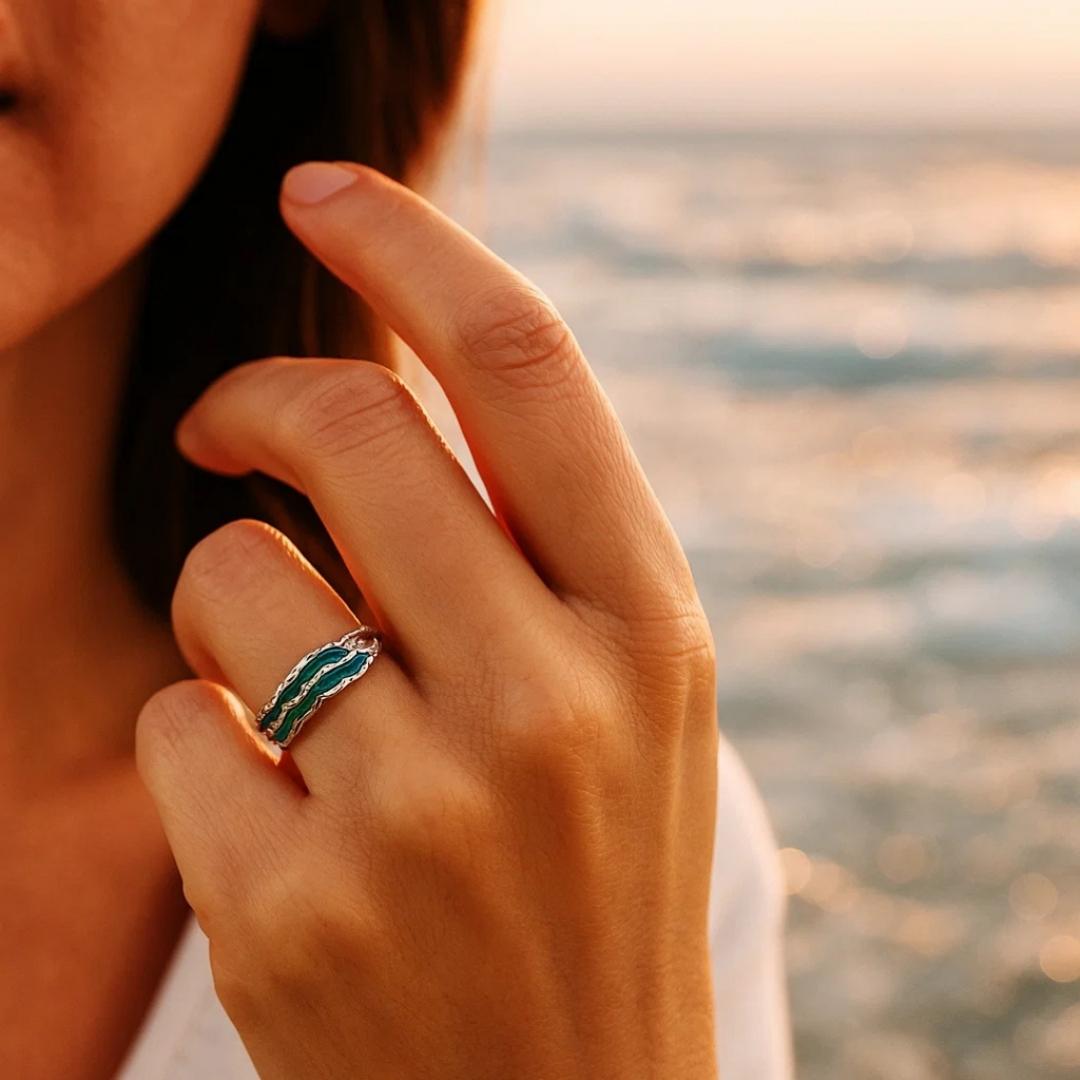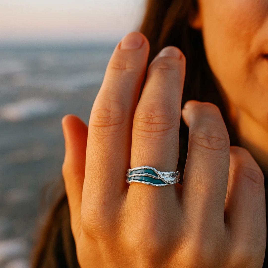 Un profilo mosso, come sabbia modellata dall’acqua fredda, accoglie pennellate verde-turchese che ricordano il mare invernale. La fascia aperta disegna un’onda discreta ma luminosa: boho, femminile, facile da indossare ogni giorno—da sola per un tocco essenziale o in stack per aggiungere ritmo e luce.