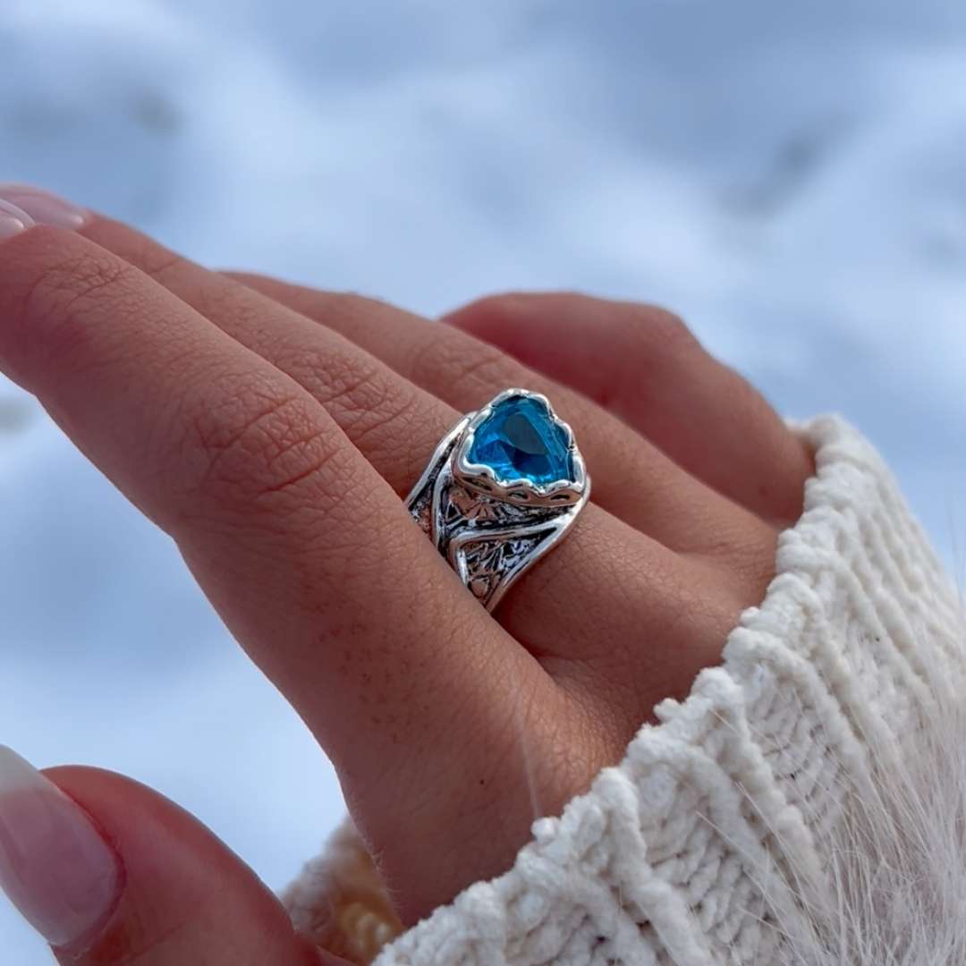 La pietra, tagliata a forma di cuore e dal colore azzurro ghiaccio, riflette la luce in modo affascinante, portando un frammento del mare invernale direttamente sulla pelle.