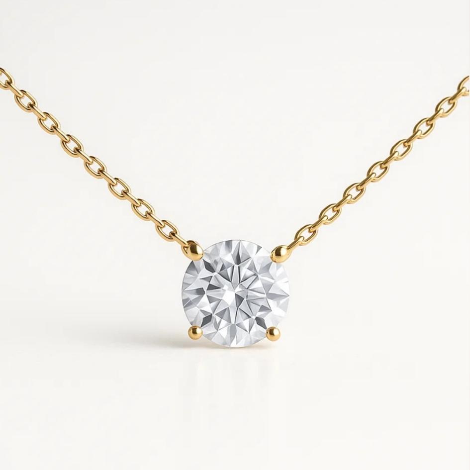 Sospeso da una sottile catenina dorata, il cristallo solitario e radioso riflette il bagliore celeste che si vede solo nelle notti piรน limpide del Sahara.