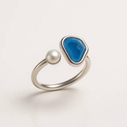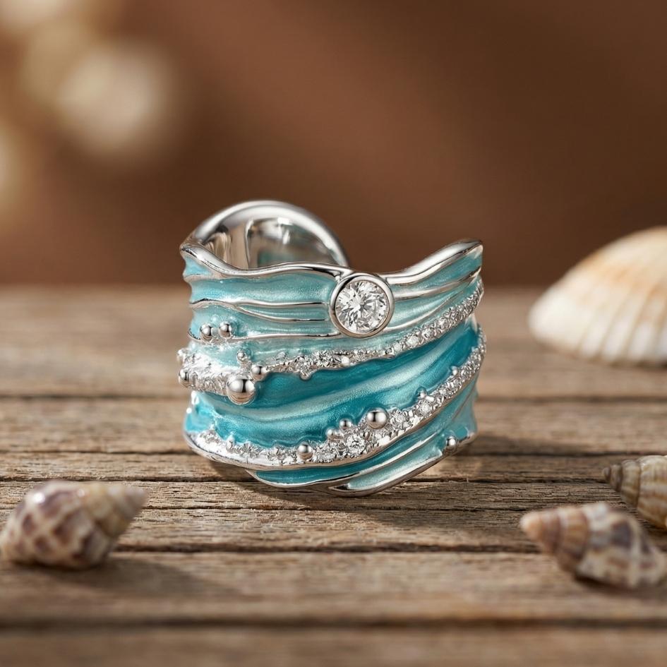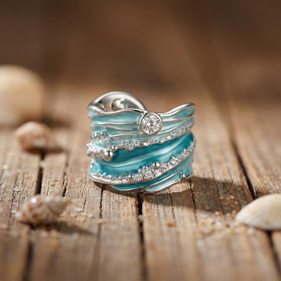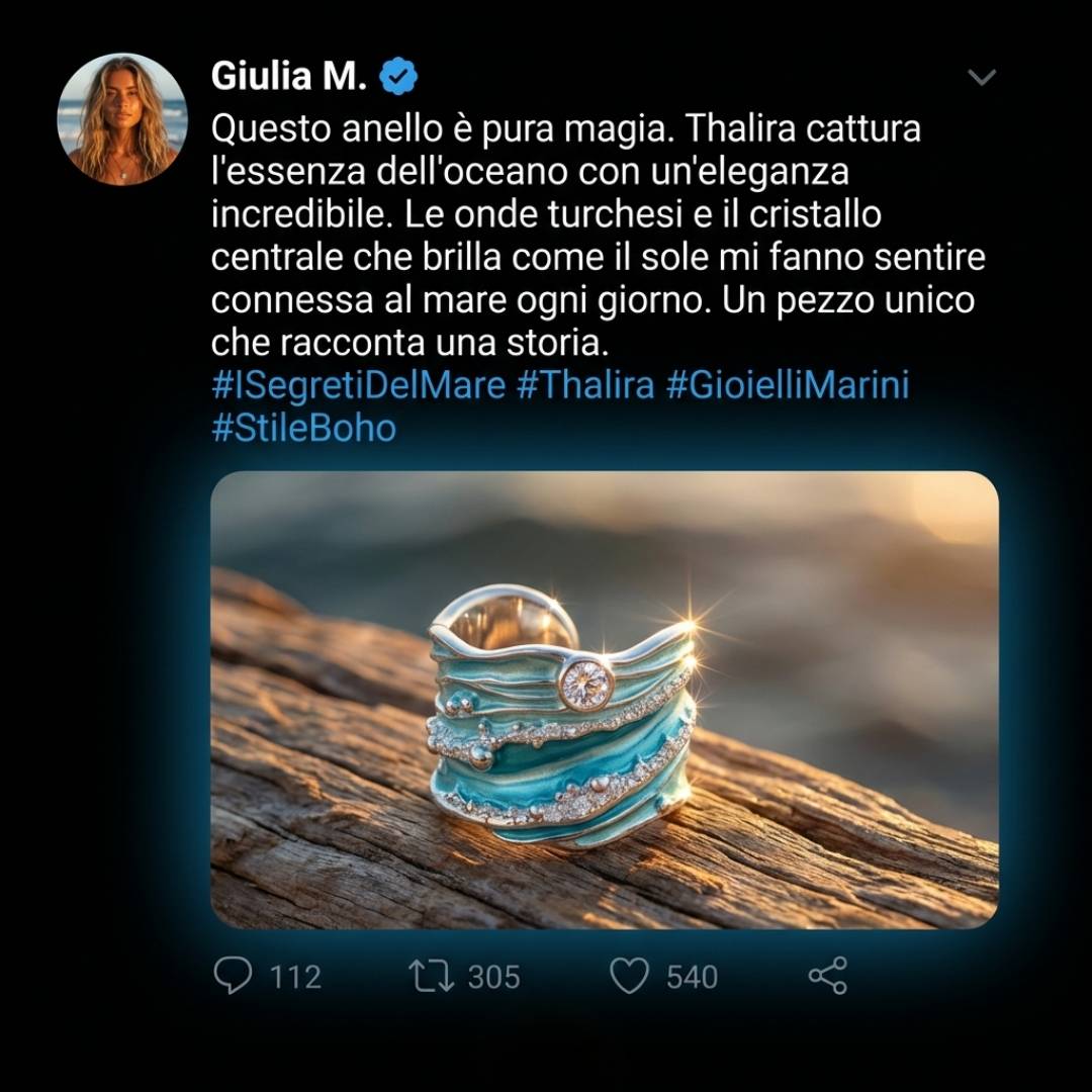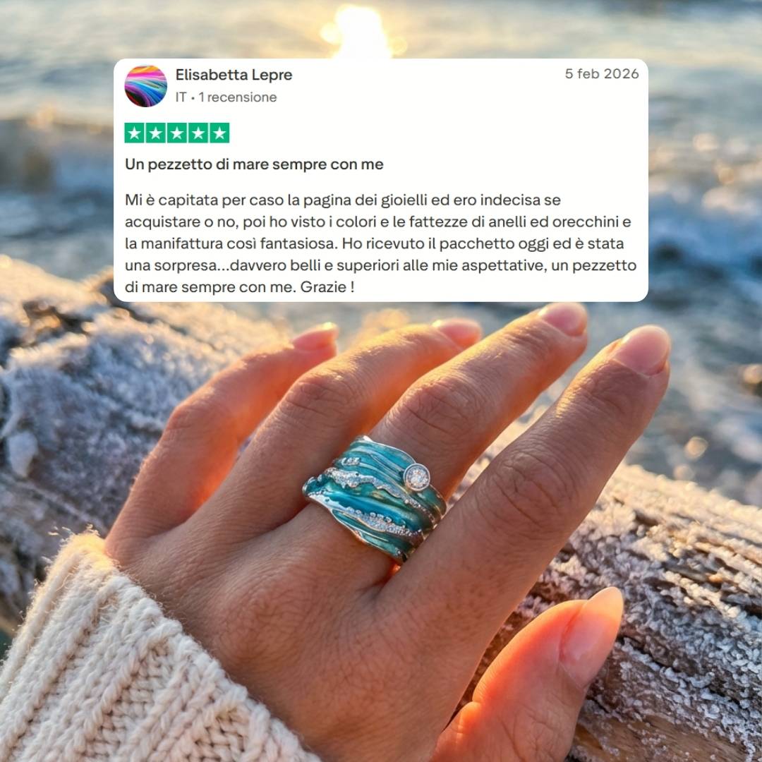 Thalira avvolge il dito come un’onda alta che si frange in mille riflessi: strati turchesi si intrecciano al metallo lucido, mentre il cristallo centrale brilla come un raggio di sole sul mare in movimento. Un anello importante, pensato per chi ama dettagli che si notano al primo sguardo.
