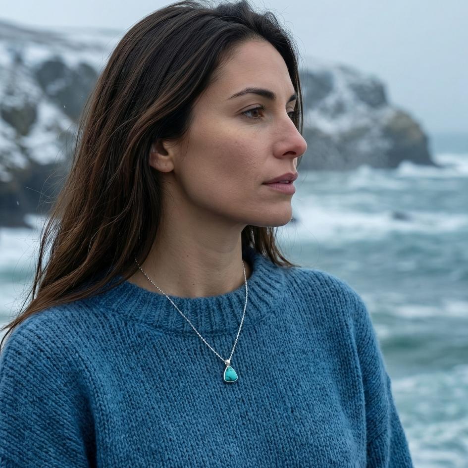 Tiseide è una collana che sembra racchiudere un piccolo frammento di mare calmo: la pietra turchese, con le sue venature naturali, ricorda una baia segreta vista dall’alto. Minimal ma piena di carattere, illumina maglioni invernali, camicie bianche e ogni look che ha bisogno di un tocco d’azzurro.
